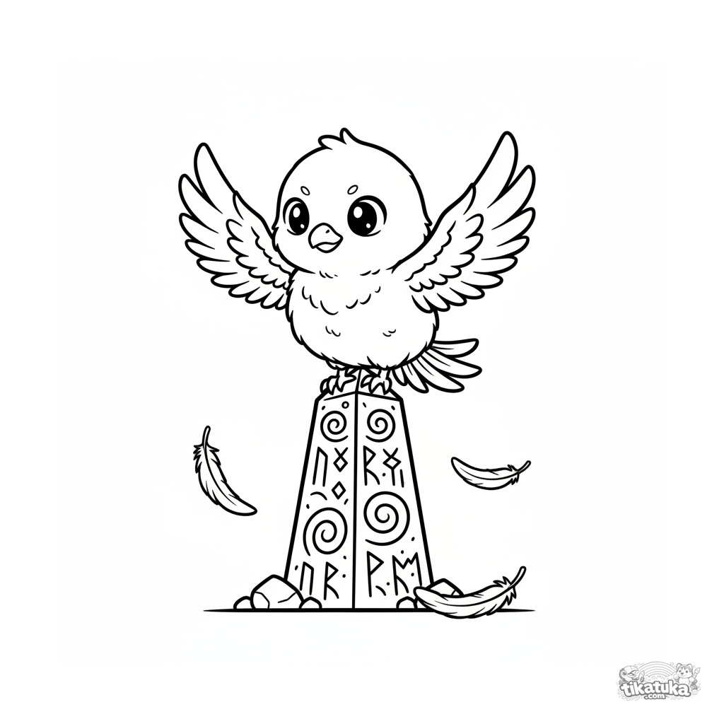 Página para colorir para crianças de 7-9 anos: um fofo filhote de fênix aprende a se equilibrar no topo de um alto monólito rúnico. Cena dinâmica e fofa em estilo anime.