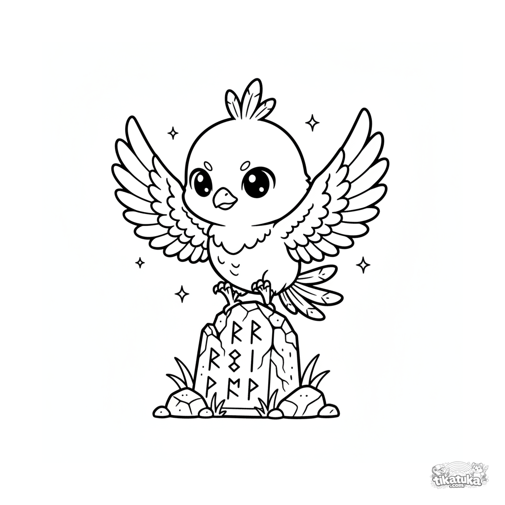 Página para colorir de um fofinho filhote de fênix aprendendo a voar perto de um pilar rúnico antigo. Para crianças de 4 a 6 anos. Criatura mágica e fofa.