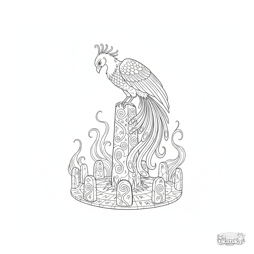 Página para colorir detalhada para crianças de 10-12 anos: uma fênix majestosa guarda um círculo de antigos monólitos rúnicos. Detalhes intrincados das penas e atmosfera mágica.