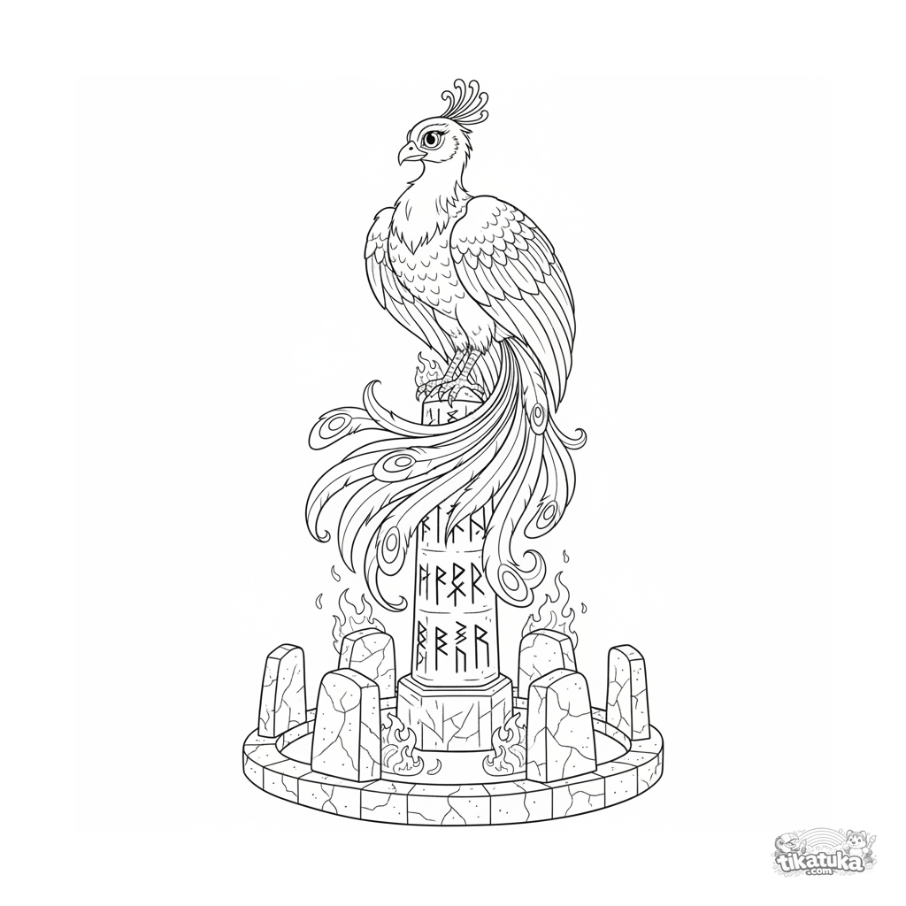 Página para colorir intrincada para crianças mais velhas 10-12: uma majestosa fênix guardiã no topo de um obelisco rúnico dentro de um círculo de pedras. Penas, chamas e símbolos antigos detalhados.