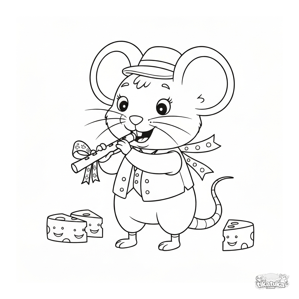 Página para colorir para crianças pequenas: um rato flautista toca flauta alegremente, seguido por pedaços de queijo. Cena engraçada e simples.
