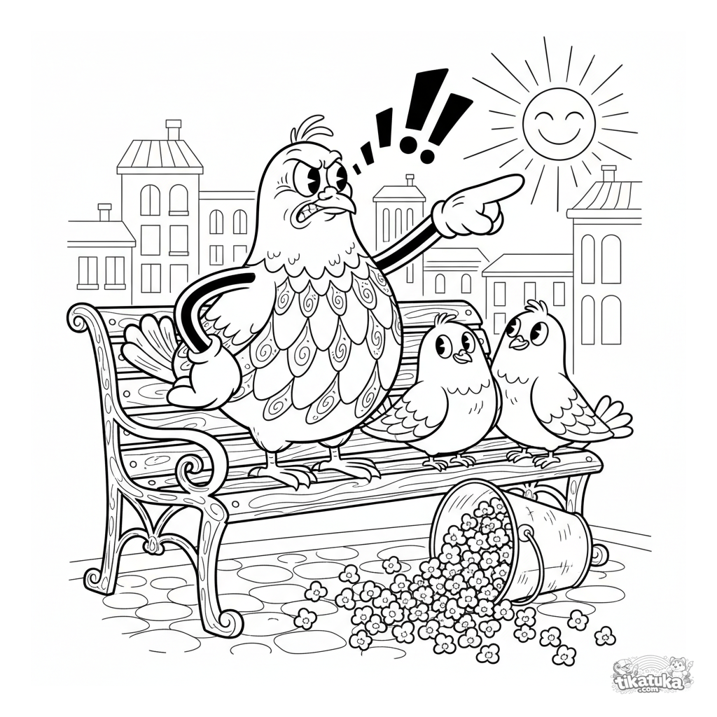 Página para colorir para crianças de 7 a 12 anos: um pombo dramático aponta para pipoca derramada em um banco da cidade. Cena engraçada no estilo de meme da internet.