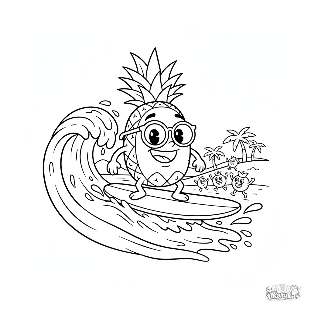 Página divertida para colorir: uma fatia de abacaxi com óculos de sol surfando numa onda de suco. Para crianças de 7-9 anos.