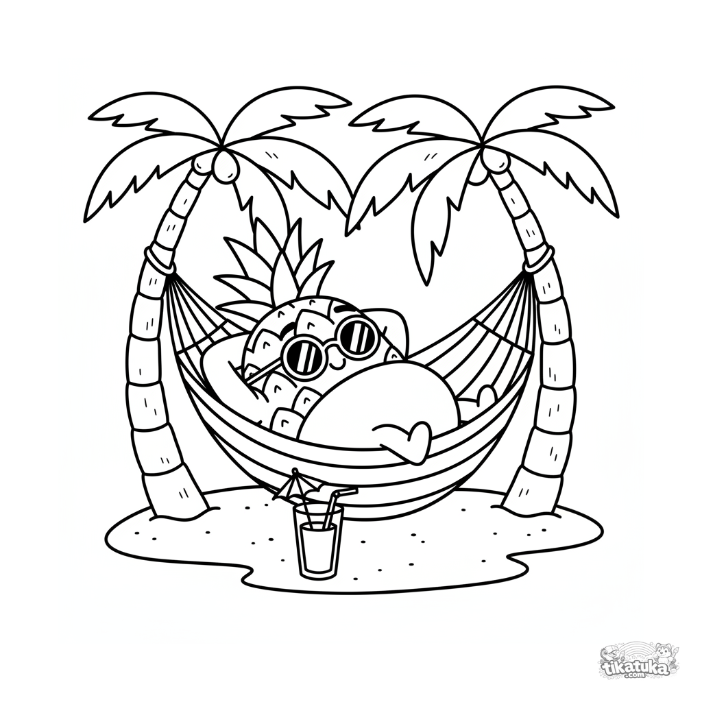 Página para colorir para crianças 4-6: um abacaxi legal de óculos de sol relaxando em uma rede listrada. Cena divertida e descontraída estilo anos 90.