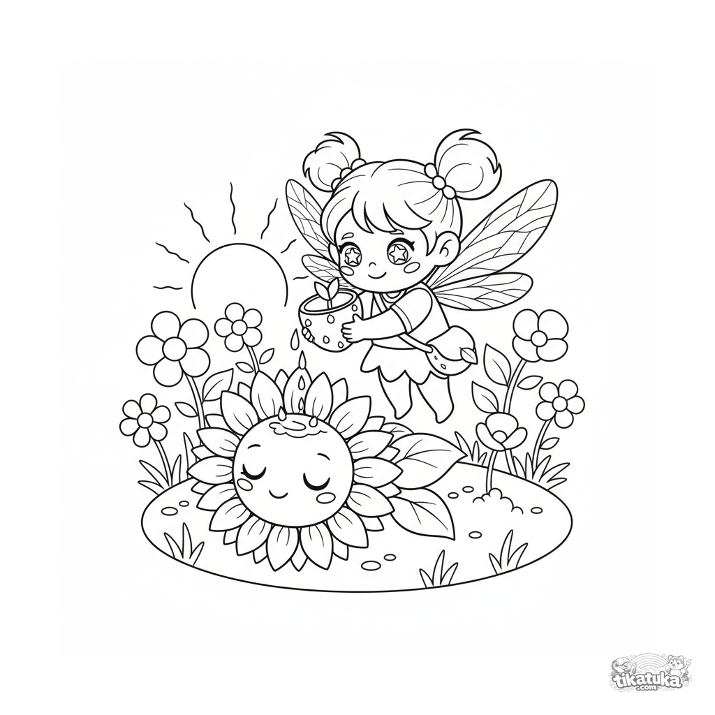 Página para colorir para 7-9 anos: uma fada minúscula com asas de libélula entrega orvalho matinal a flores adormecidas no amanhecer. Cena fofa em estilo chibi.
