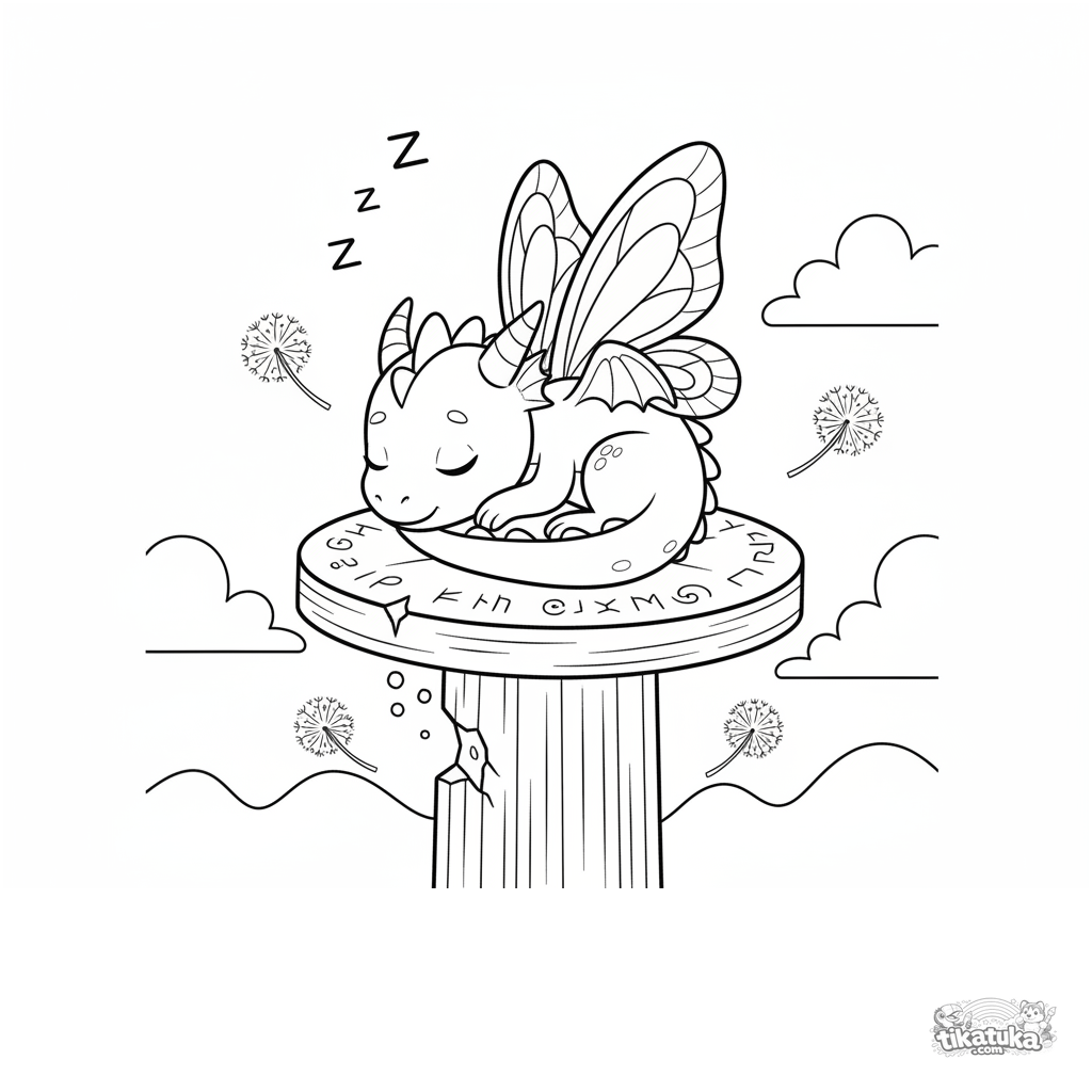 Página para colorir para crianças 4-6: um minúsculo dragão fada dorme profundamente em uma pedra rúnica redonda. Linhas suaves e fluidas, humor pacífico, formas claras.