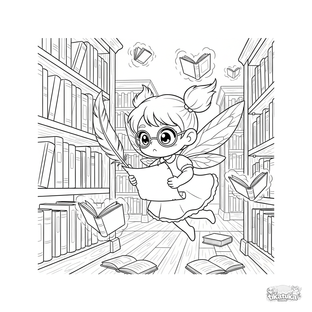 Página para colorir para 7-9 anos: uma pequena fada bibliotecária organiza livros brilhantes em uma biblioteca mágica. Cena de fantasia com detalhes.