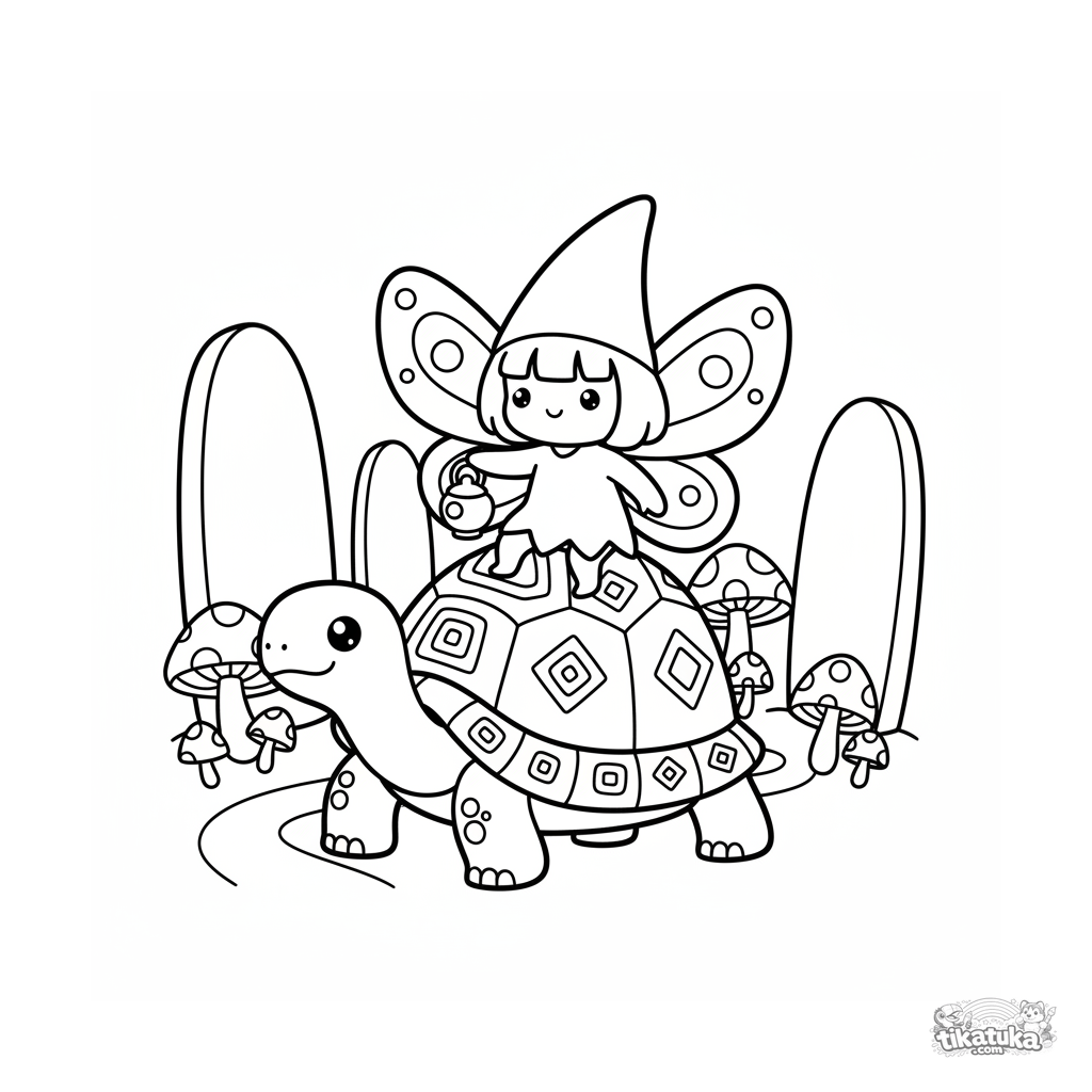 Página para colorir para crianças pequenas de 2-3 anos: uma pequena fada monta uma tartaruga por uma trilha entre monolitos antigos. Contornos muito simples.