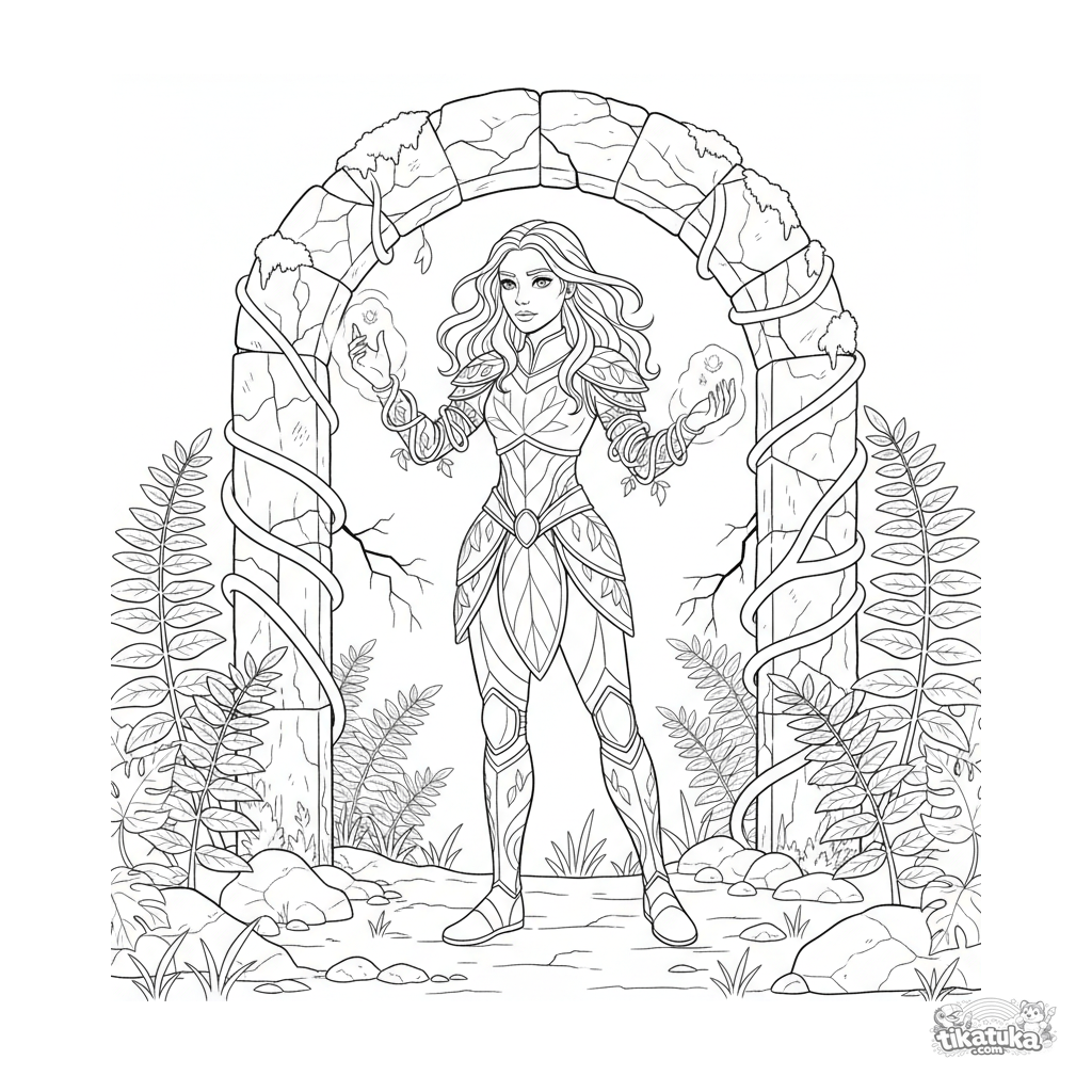 Página para colorir para crianças mais velhas 10-12: um super-herói com poderes das plantas usa trepadeiras brilhantes para reparar um arco de pedra em ruínas florestais.