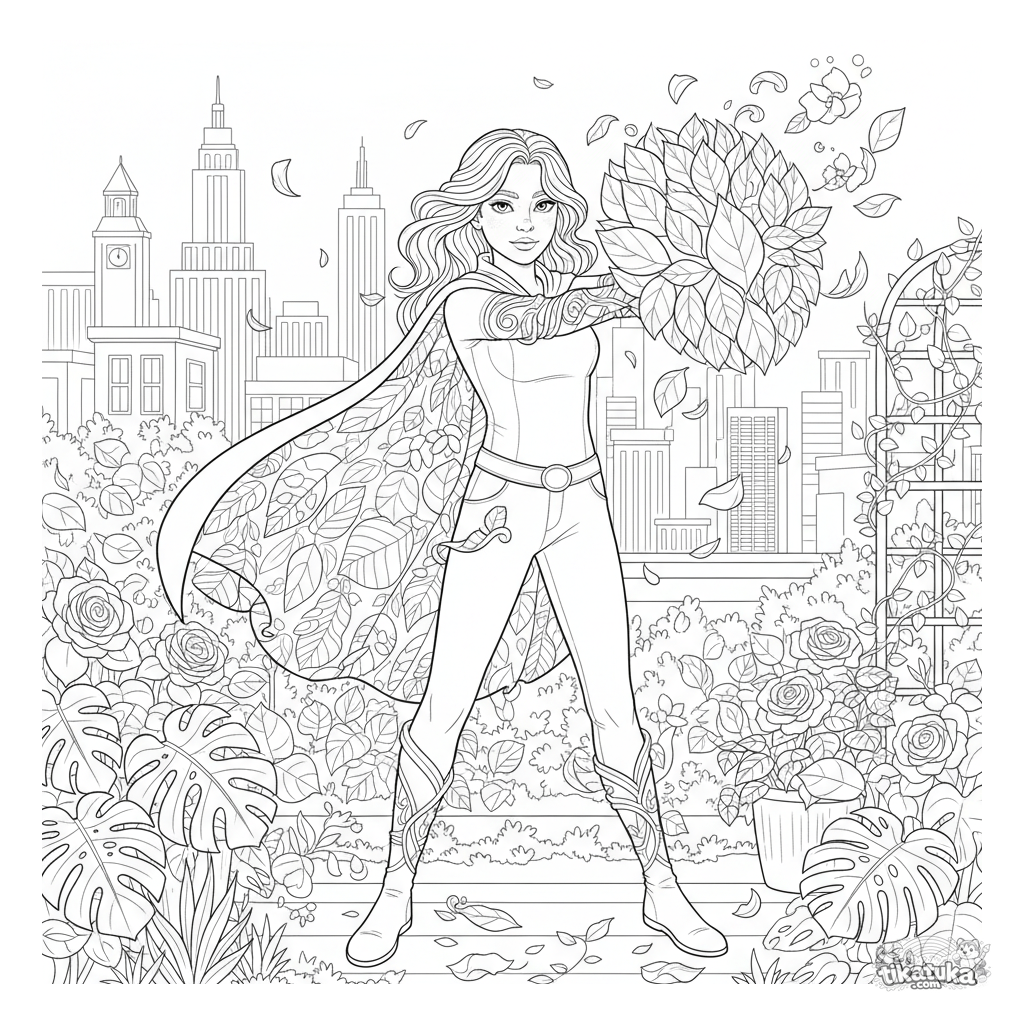 Página para colorir para crianças mais velhas de 10-12 anos: um super-herói com poder de plantas cria um escudo de folhas em um jardim no telhado.