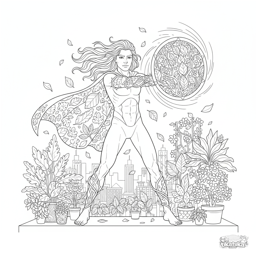 Página para colorir para 10-12 anos: um super-herói com poderes vegetais cria um escudo de folhas em um jardim de telhado urbano. Cena detalhada.