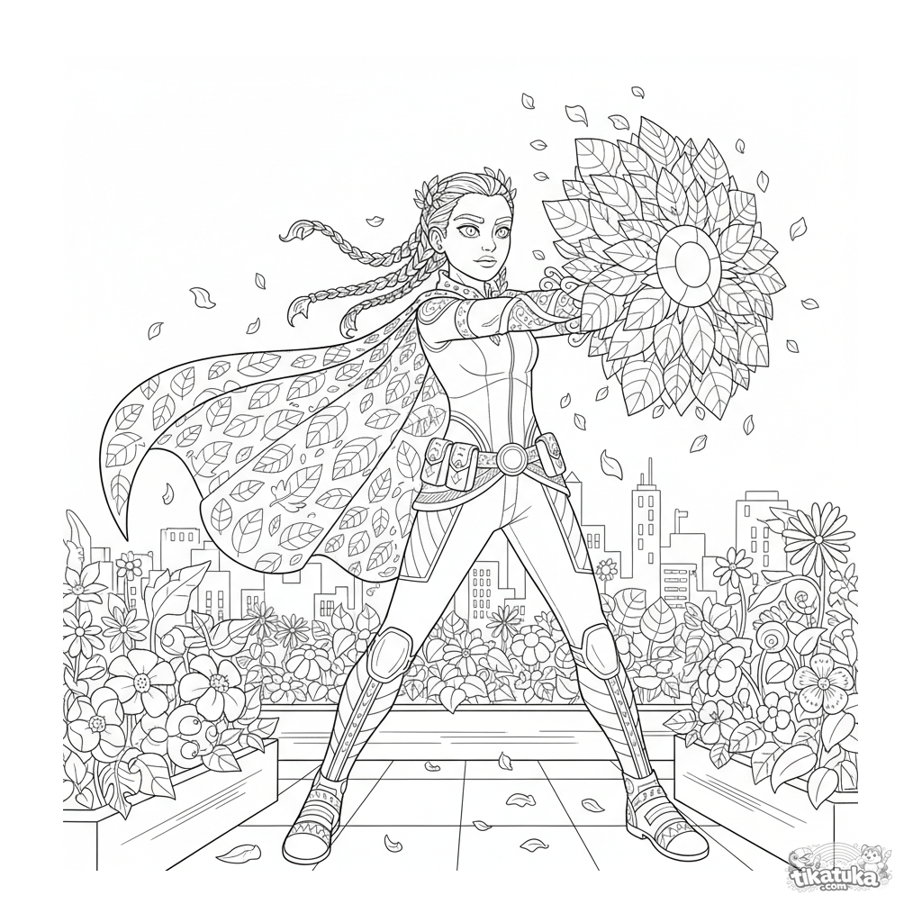 Página para colorir para crianças mais velhas 10-12: um super-herói com poderes vegetais cria um escudo de folhas em um jardim de cobertura.