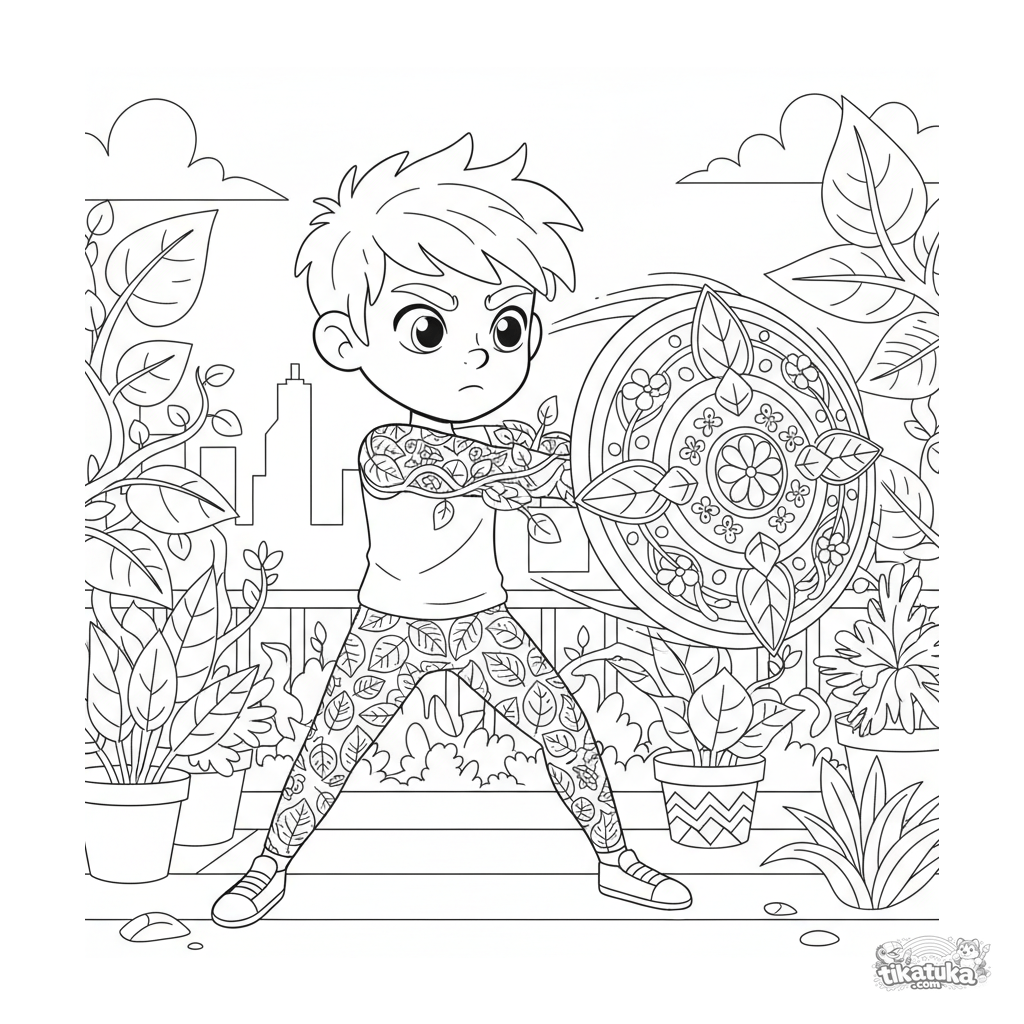 Página para colorir para crianças mais velhas de 10-12 anos: um herói planta treina criando um escudo de folhas em um jardim no telhado.