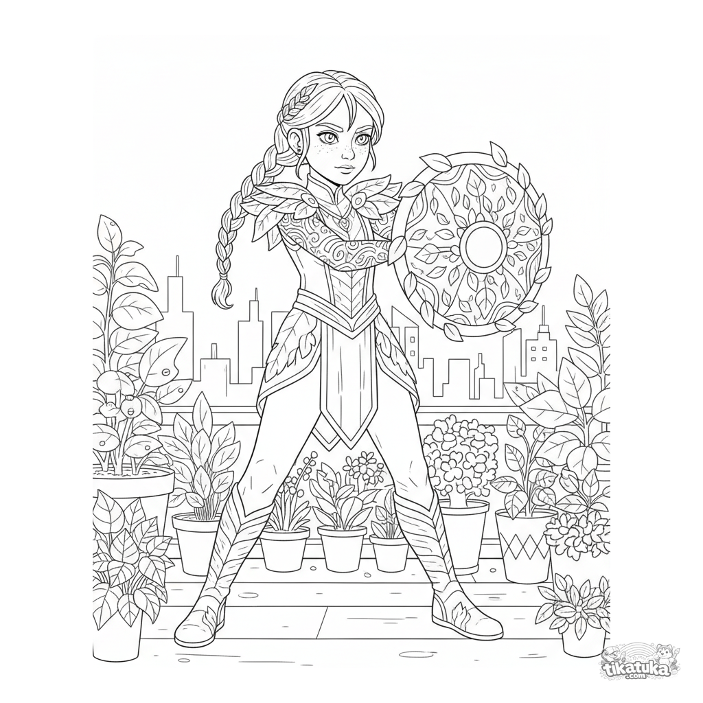 Página para colorir para crianças mais velhas 10-12: um super-herói com poderes de planta pratica criar um escudo de videira em um jardim no telhado.