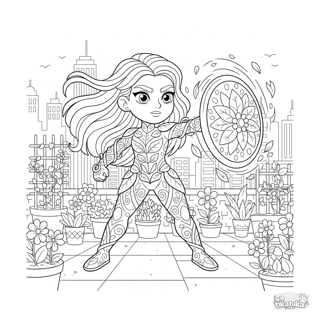 Página para colorir para maiores 10-12: um super-herói com poderes de plantas cria um escudo de folhas em um jardim no telhado, expressão determinada.