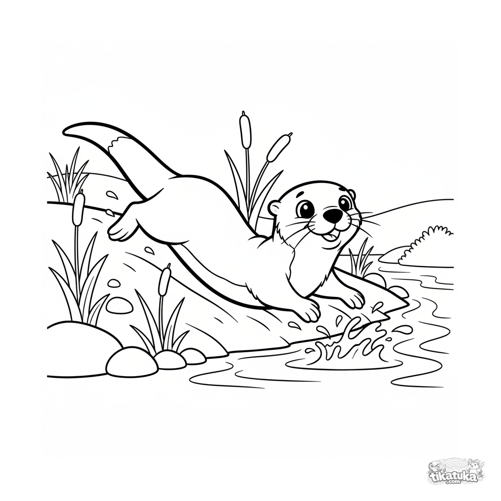 Página para colorir para crianças 7-9: uma lontra brincalhona deslizando alegremente por uma margem lamacenta em um riacho claro. Pose dinâmica, respingos, taboas.