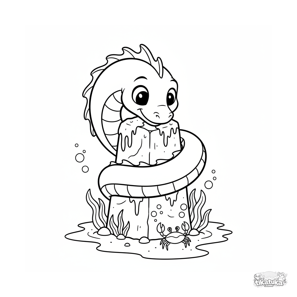 Página para colorir divertida para crianças de 4-6 anos: uma serpente marinha travessa brinca se enrolando em um antigo monólito em uma poça de maré. Formas dinâmicas e engraçadas.
