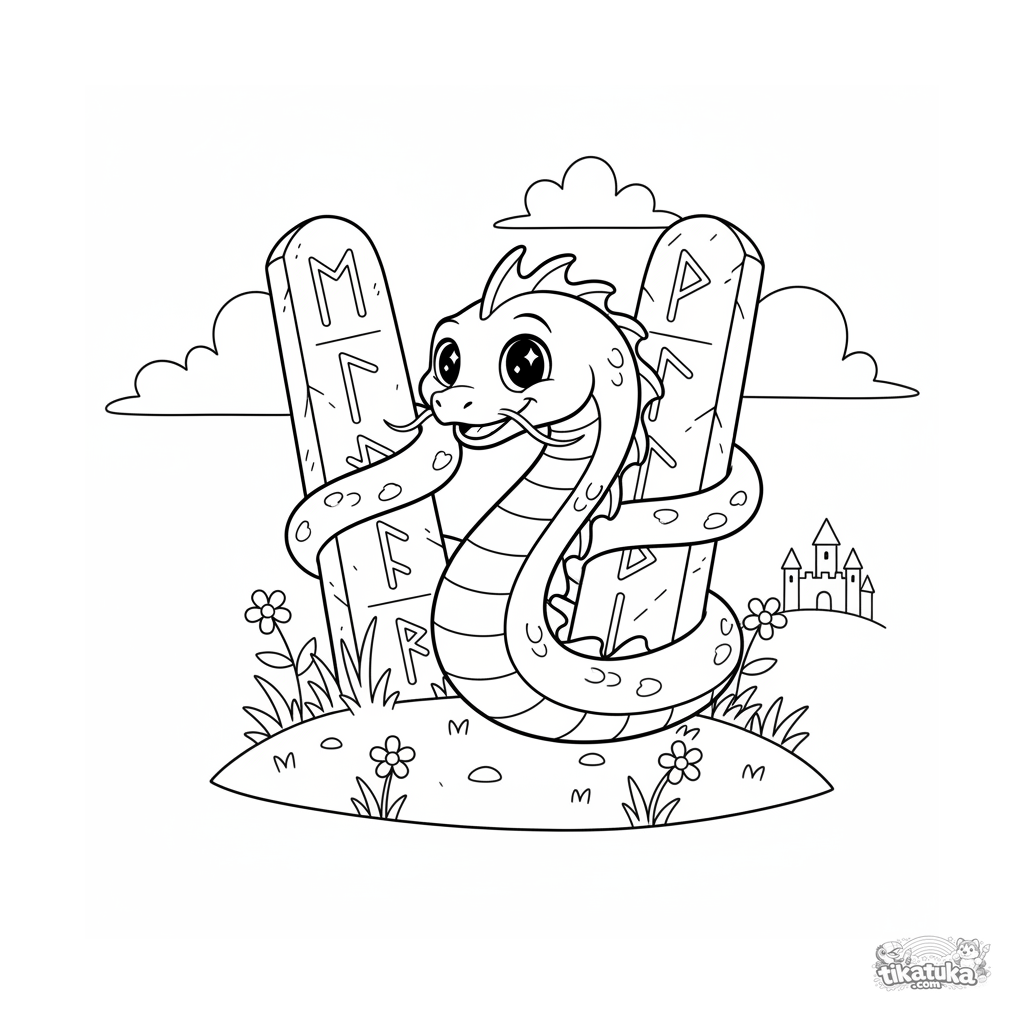 Página para colorir para crianças de 7-9 anos: uma serpente marinha amigável se enrola brincando em torno de antigos monólitos rúnicos. Pose dinâmica, rosto expressivo.