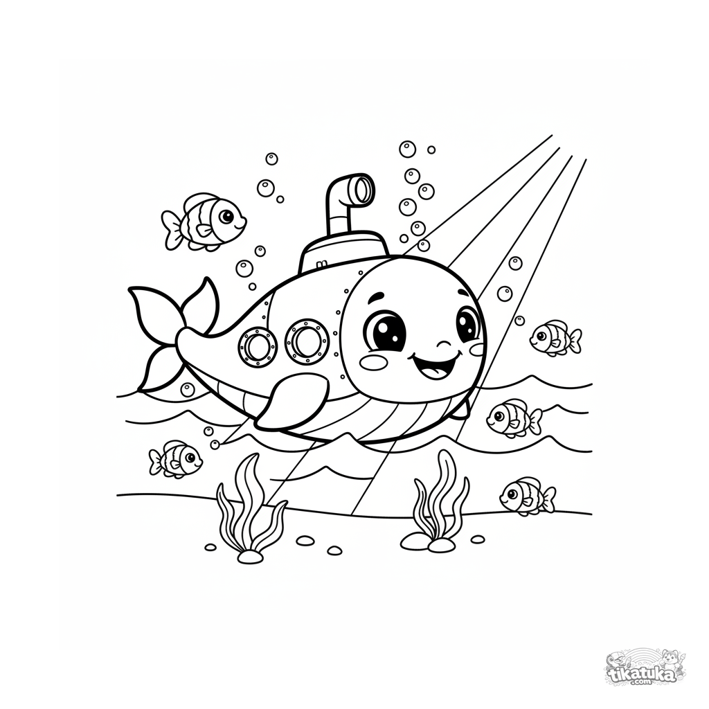 Página para colorir para crianças 4-6: um submarino divertido em forma de baleia sorridente nada entre peixes e bolhas. Design amigável e fundo simples são perfeitos para colorir.