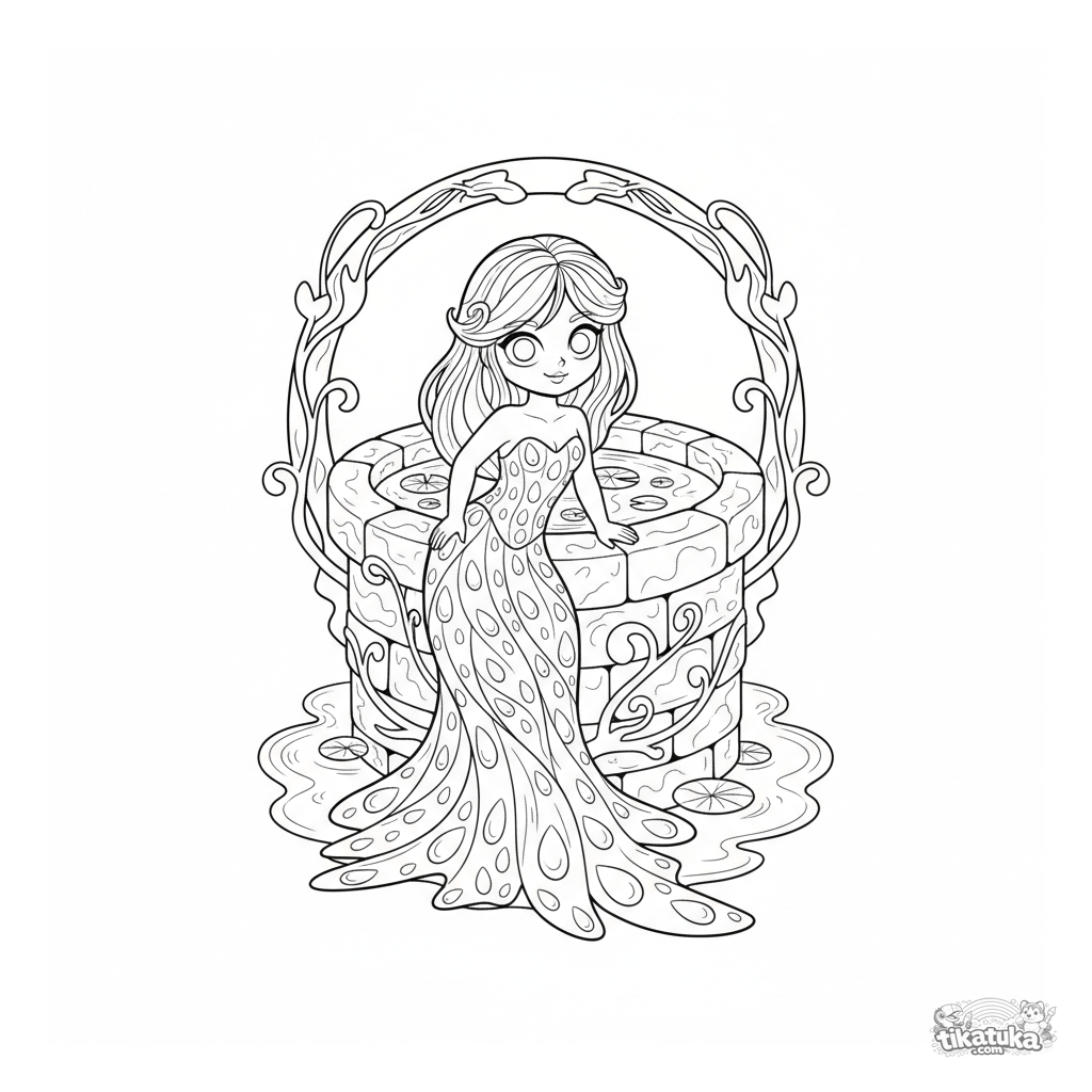 Página para colorir para crianças 7-9: um espírito da água brincalhão espreita do poço de água viva. Cena no estilo art nouveau com linhas fluidas.