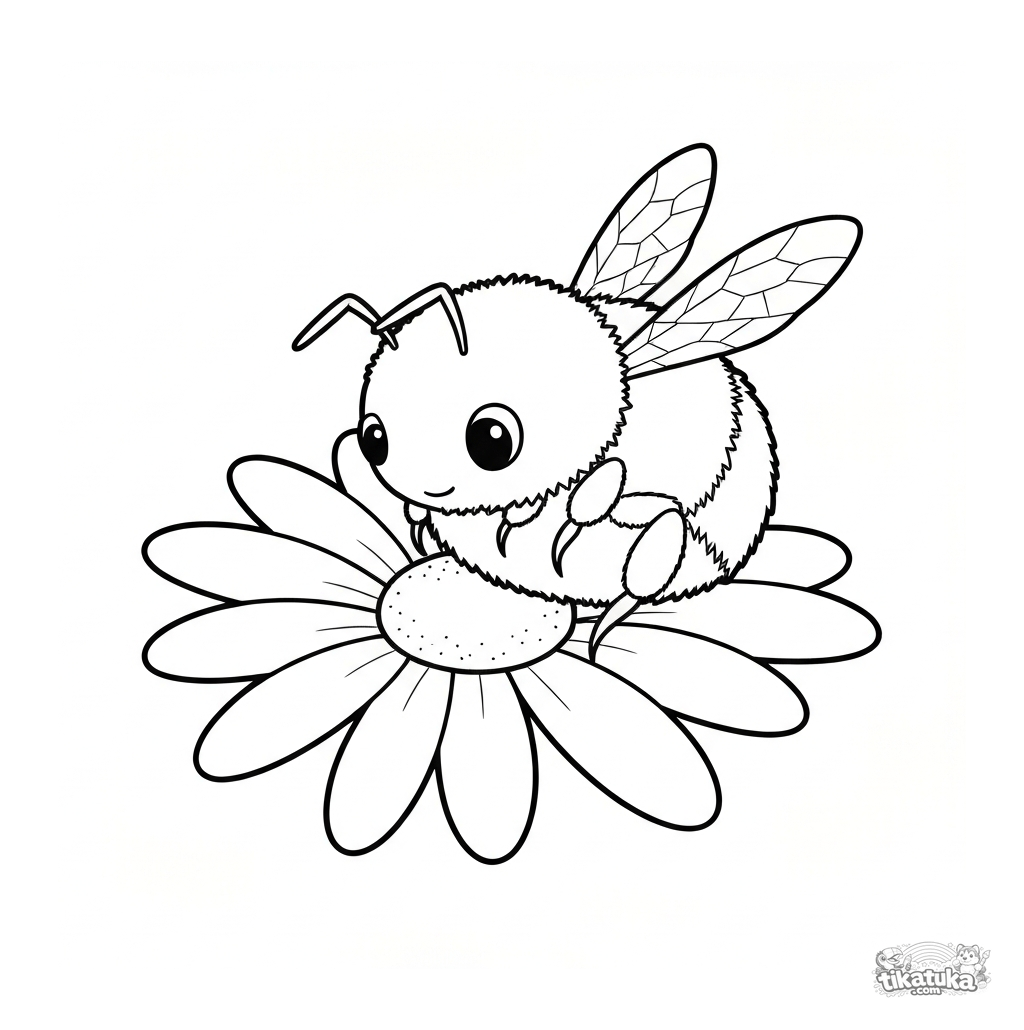 Página simples para colorir para bebês: um abelhão fofinho na pétala de uma margarida. Imagem grande com contornos grossos para crianças a partir de 2 anos.