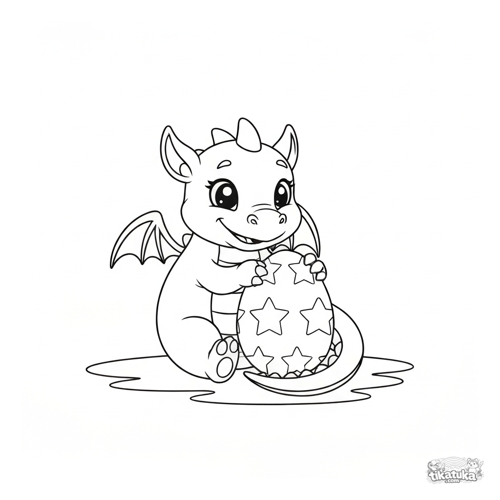 Página para colorir para crianças: um dragão bebê redondo e amigável guarda um ovo grande com padrão de estrelas. Cena de conto de fadas simples e fofa.