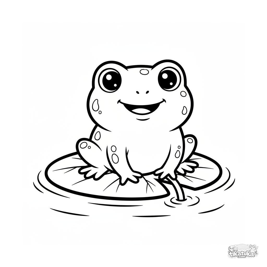 Página para colorir simples para crianças pequenas 2-3: um sapo gorducho e alegre senta-se em uma vitória-régia perto de um riacho. Formas grandes e simples, margens muito amplas.