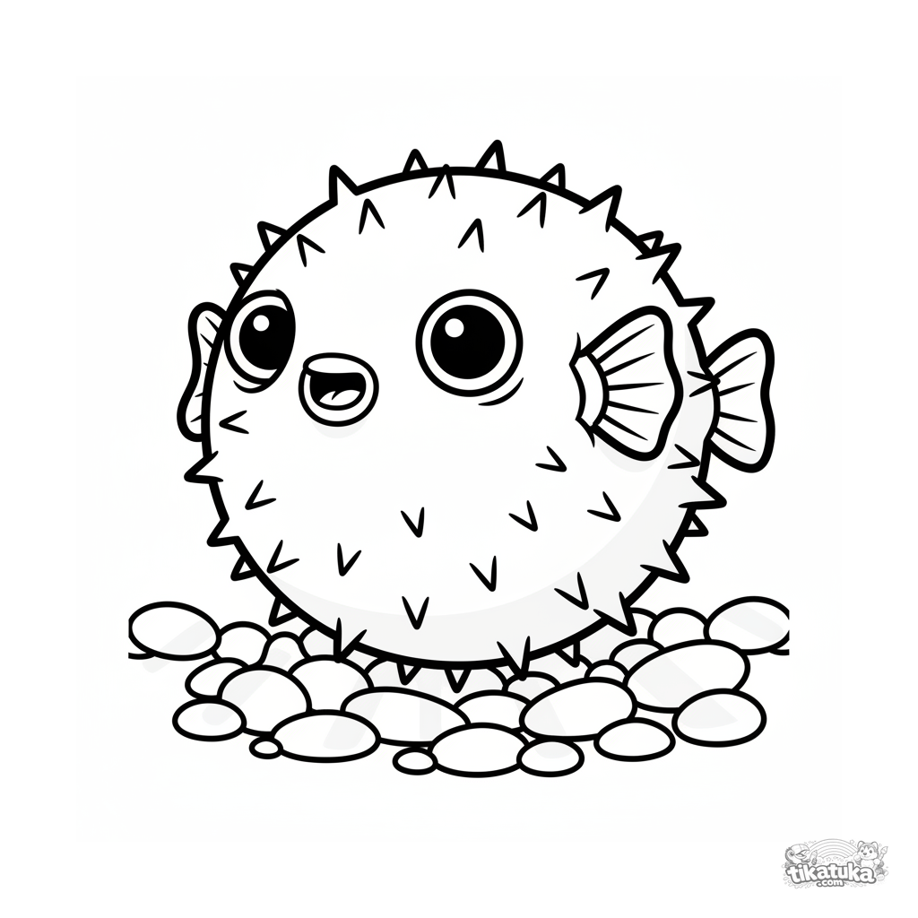 Página para colorir simples para crianças de 2-3 anos: um baiacu redondo inflado entre seixos em águas rasas e ensolaradas.