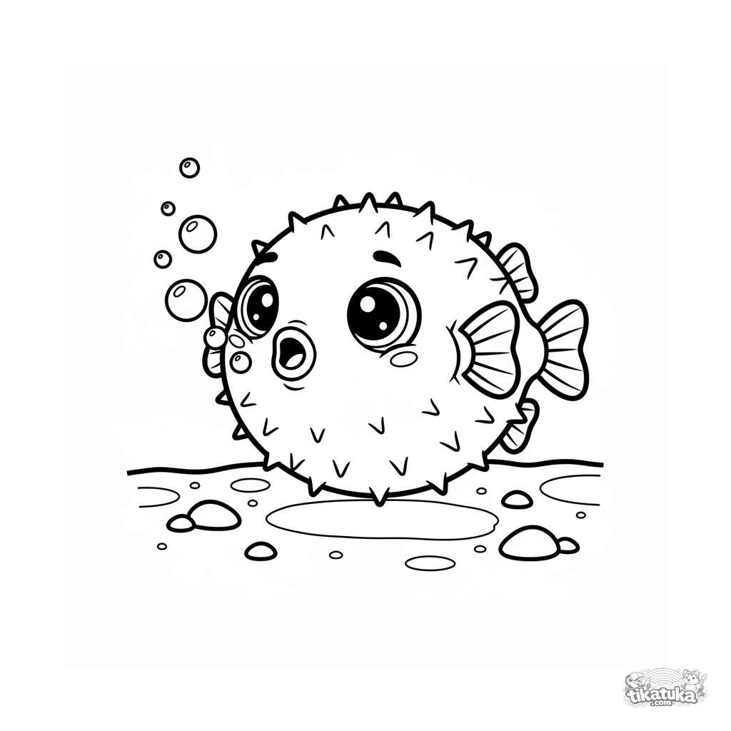 Página para colorir simples para bebês de 2 a 3 anos: um baiacu inflando entre seixos em água ensolarada.