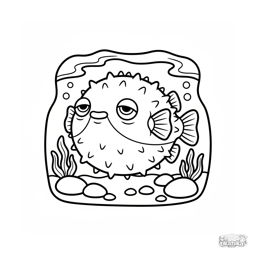 Página para colorir simples para bebês de 2-3 anos: Um baiacu redondo descansa em uma poça de maré ensolarada em águas rasas.