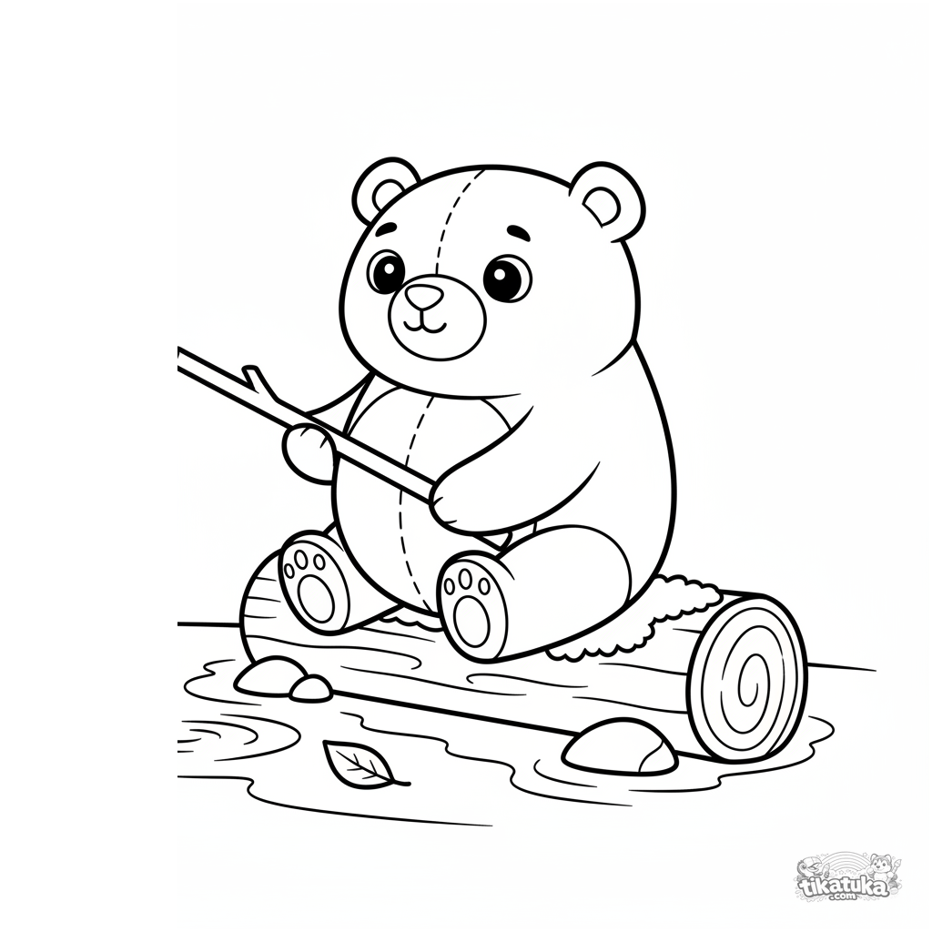 Página para colorir simples para crianças pequenas 2-3: um urso de pelúcia senta em um tronco perto de um riacho tentando pescar com um graveto.