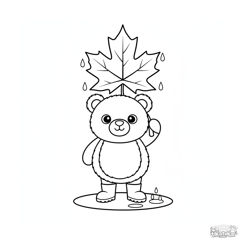 Página para colorir para bebês 2-3: um urso de pelúcia de botas sob uma folha de bordo como guarda-chuva na chuva de outono.