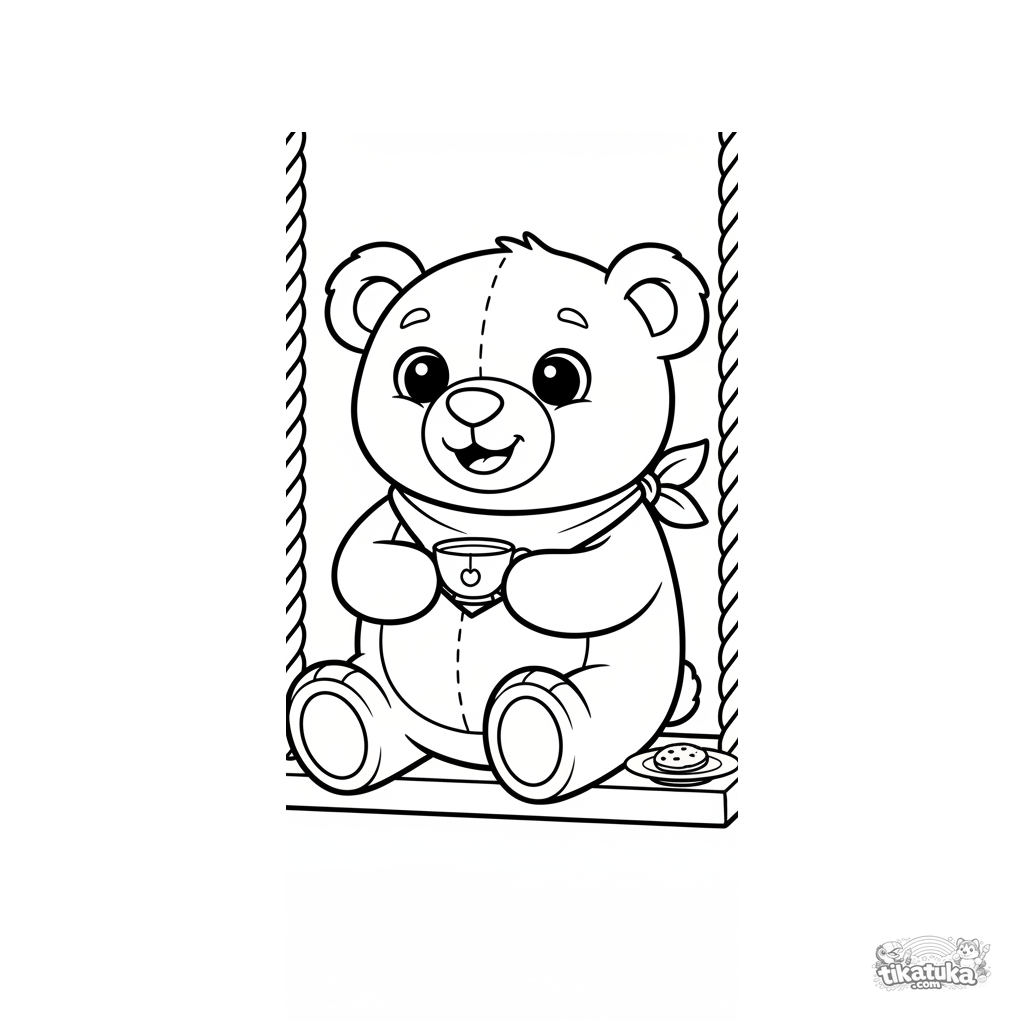 Página para colorir para bebês 2-3 anos: um grande urso de pelúcia senta-se num balanço na varanda segurando uma xícara de chá. Formas simples e grandes.