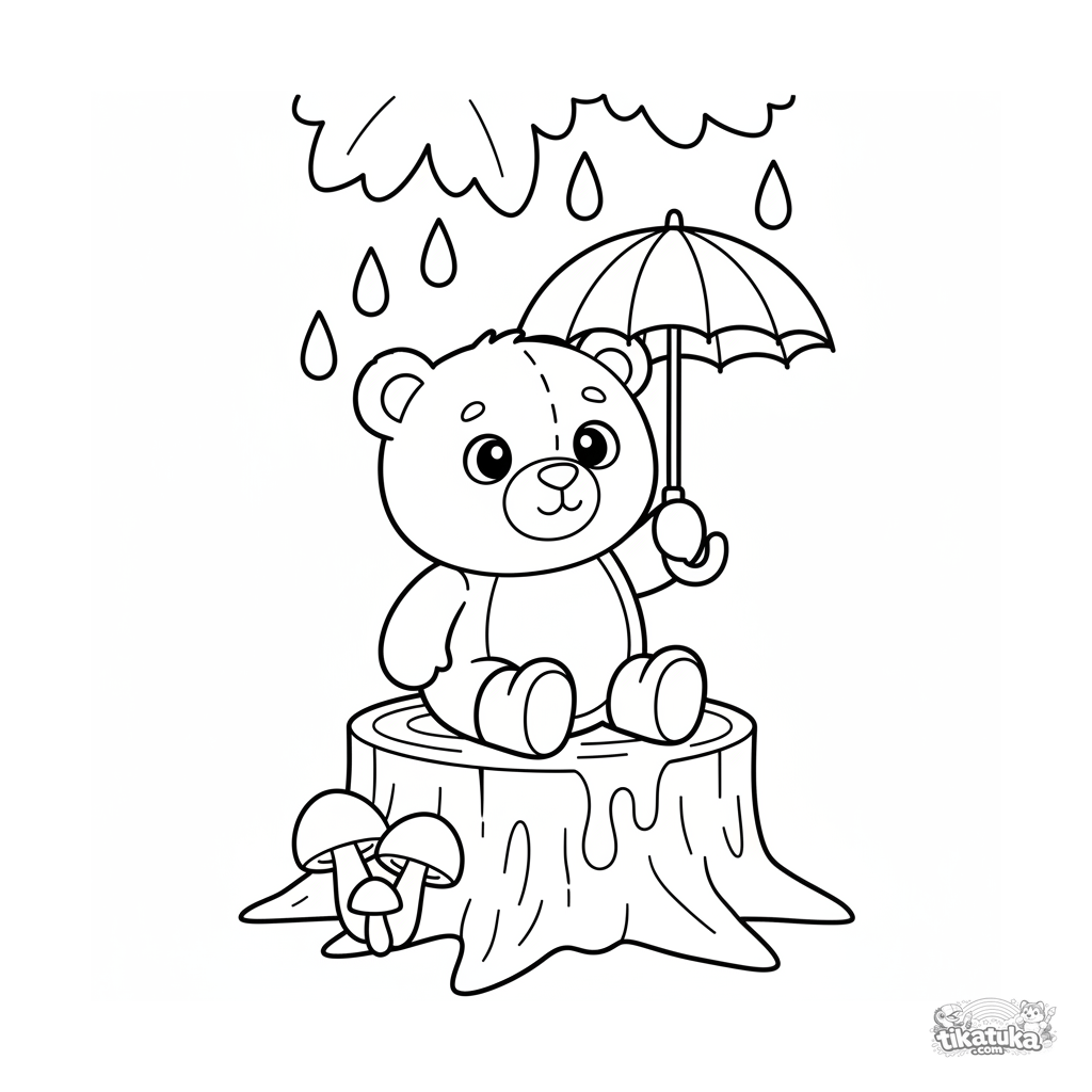 Página simples para colorir para crianças 2-3: um urso de pelúcia com botas senta em um toco sob guarda-chuva na chuva de outono.
