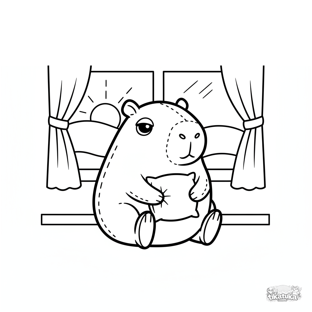 Página simples para colorir para bebês de 2-3 anos: uma capivara de pelúcia abraça um travesseiro na janela observando o pôr do sol.