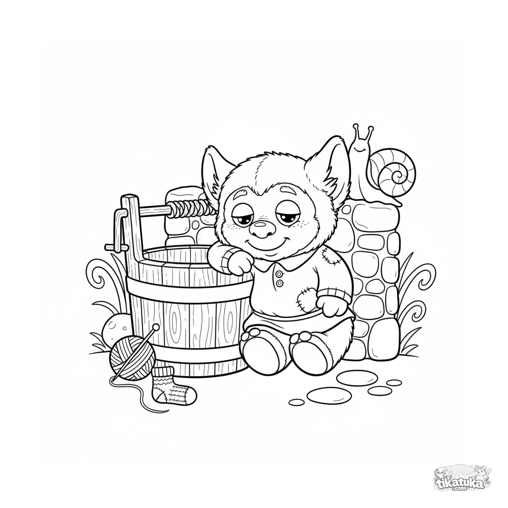 Página para colorir para crianças 4-6: um domovoy de pelúcia aconchegante adormeceu junto ao poço de água viva. Cena fofa com um novelo de fio, uma meia e um caracol.