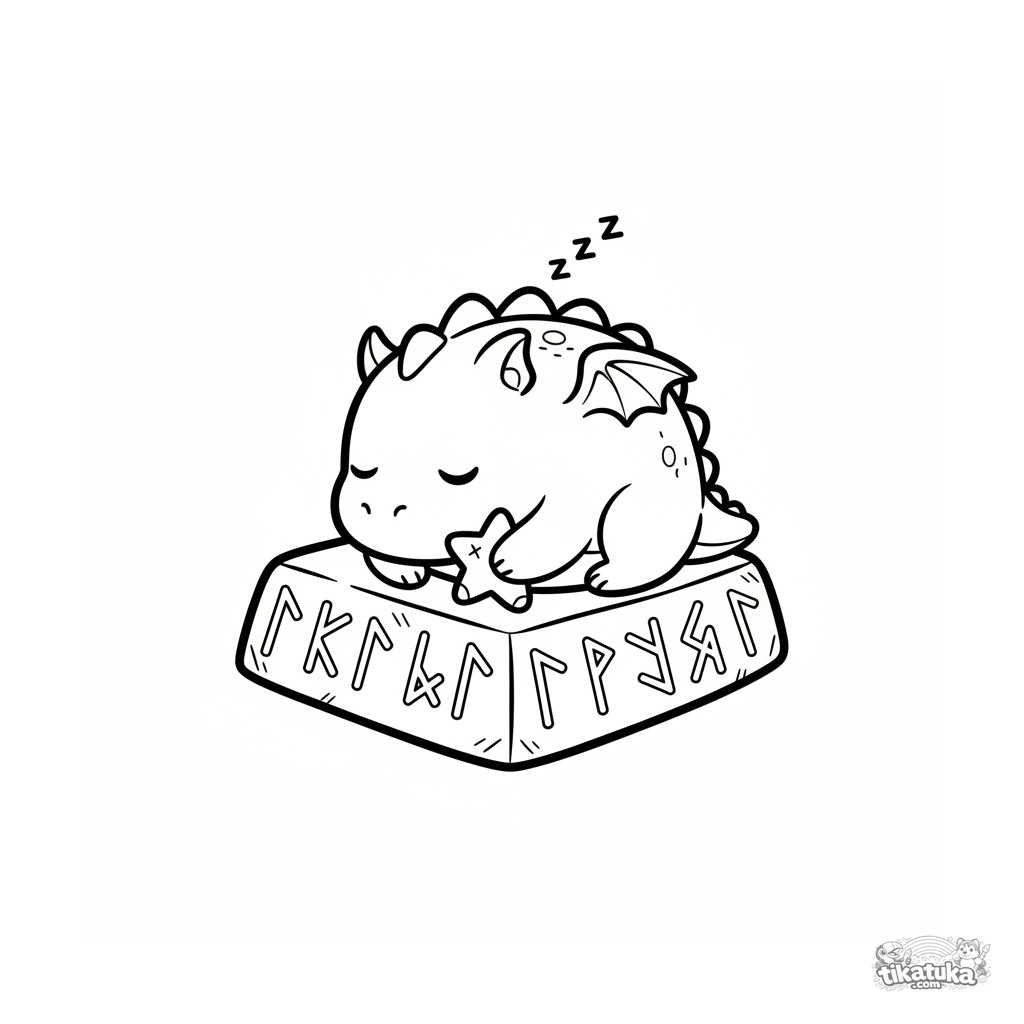 Página para colorir simples para crianças pequenas de 2-3 anos: um dragão de pelúcia dorme profundamente em uma grande pedra rúnica. Formas grandes fechadas, muito poucas linhas internas.