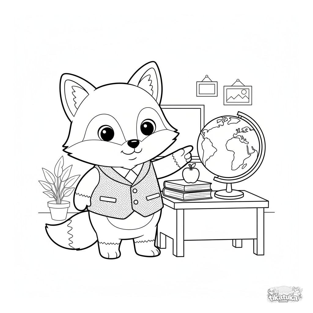 Página para colorir para crianças 4-6: um professor raposa em uma sala de aula com um globo e livros didáticos. Cena amigável.
