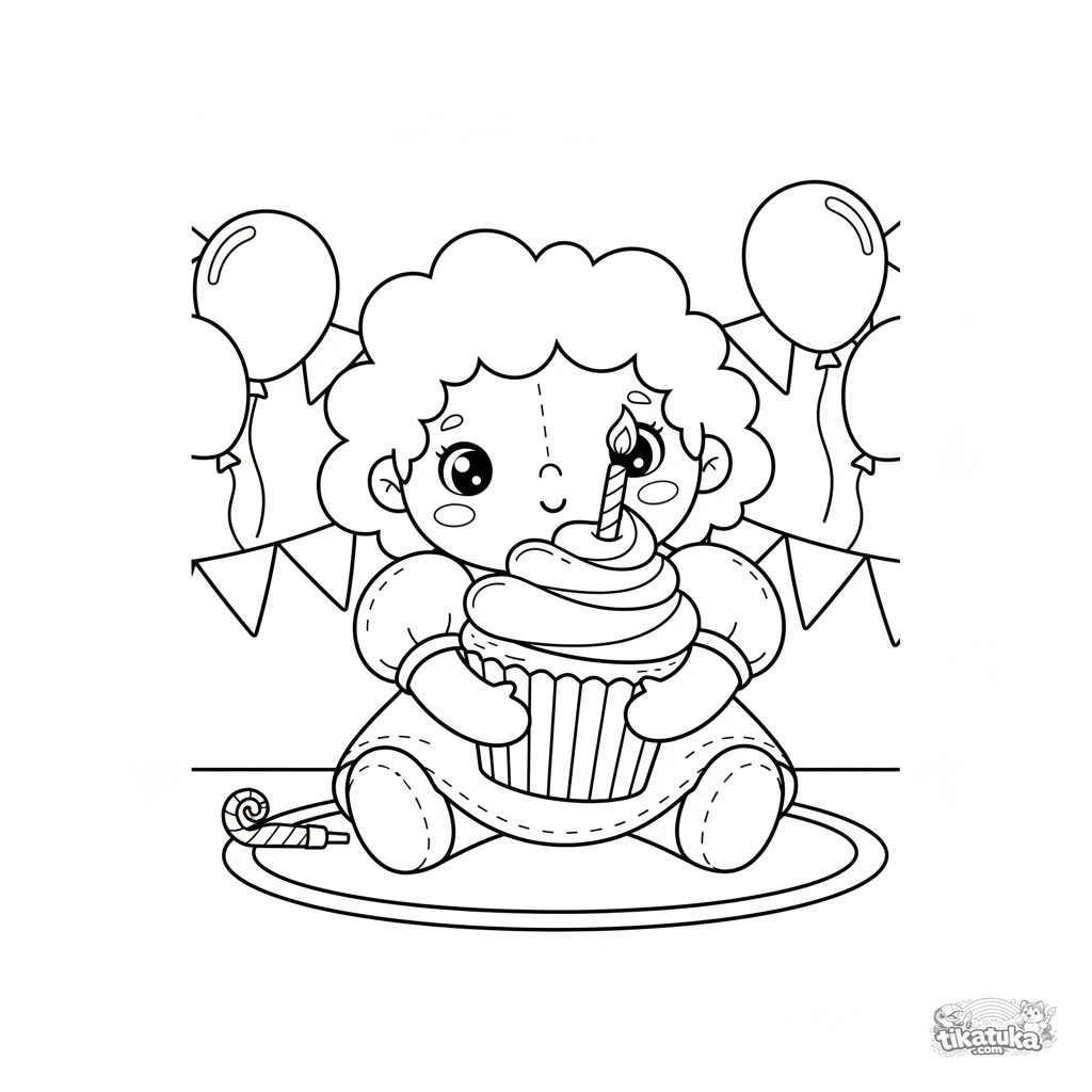 Página para colorir muito simples para crianças de 2 a 3 anos: uma menina de pelúcia abraça um cupcake gigante. Formas grandes e fechadas.