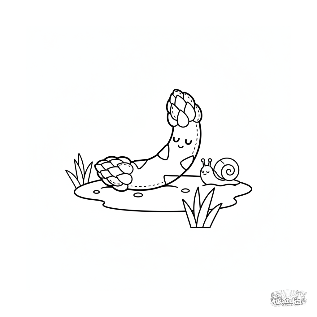 Página simples para colorir para bebês: um aspargo de pelúcia dormindo num canteiro. Formas grandes, poucos detalhes. Para 2-3 anos.