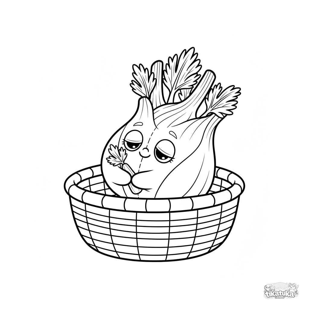 Página simples para colorir para crianças pequenas: um bulbo de funcho de pelúcia dorme em uma cesta. Formas grandes e macias, margens amplas.