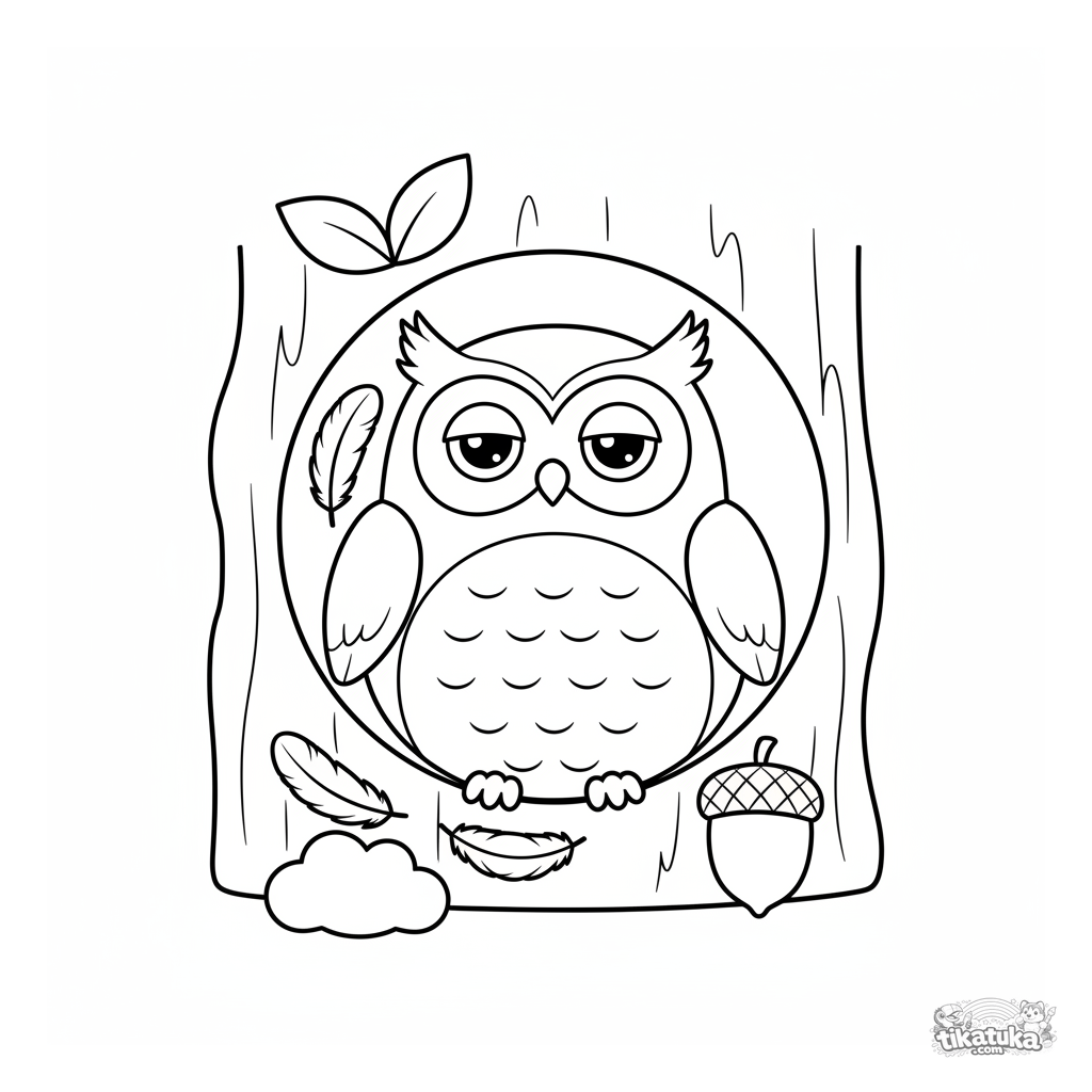 Página para colorir simples para os mais pequenos: uma coruja de pelúcia aconchegada em um oco de árvore. Formas grandes e margens amplas para 2-4 anos.