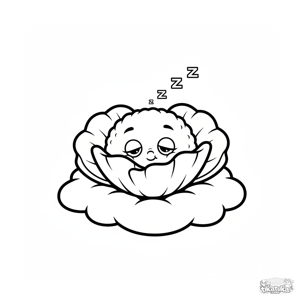 Página para colorir para crianças pequenas 2-3 anos: uma papoula de pelúcia dorme profundamente em uma nuvem fofa. Formas grandes e simples, poucos detalhes.