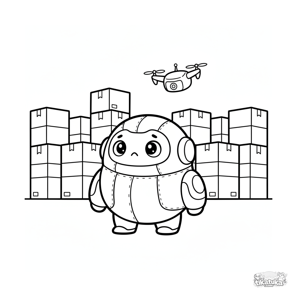 Página simples para colorir para os mais pequenos: um robô fofo de pelúcia parece confuso entre caixas em um armazém. Formas grandes e macias.