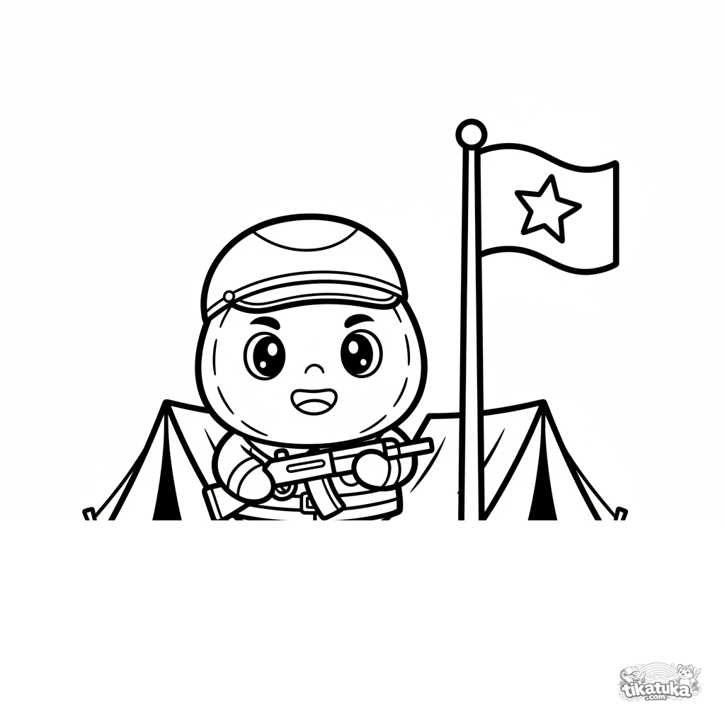 Página para colorir muito simples para crianças pequenas 2-3: um soldado de pelúcia fofo faz guarda junto a um mastro de bandeira no acampamento.