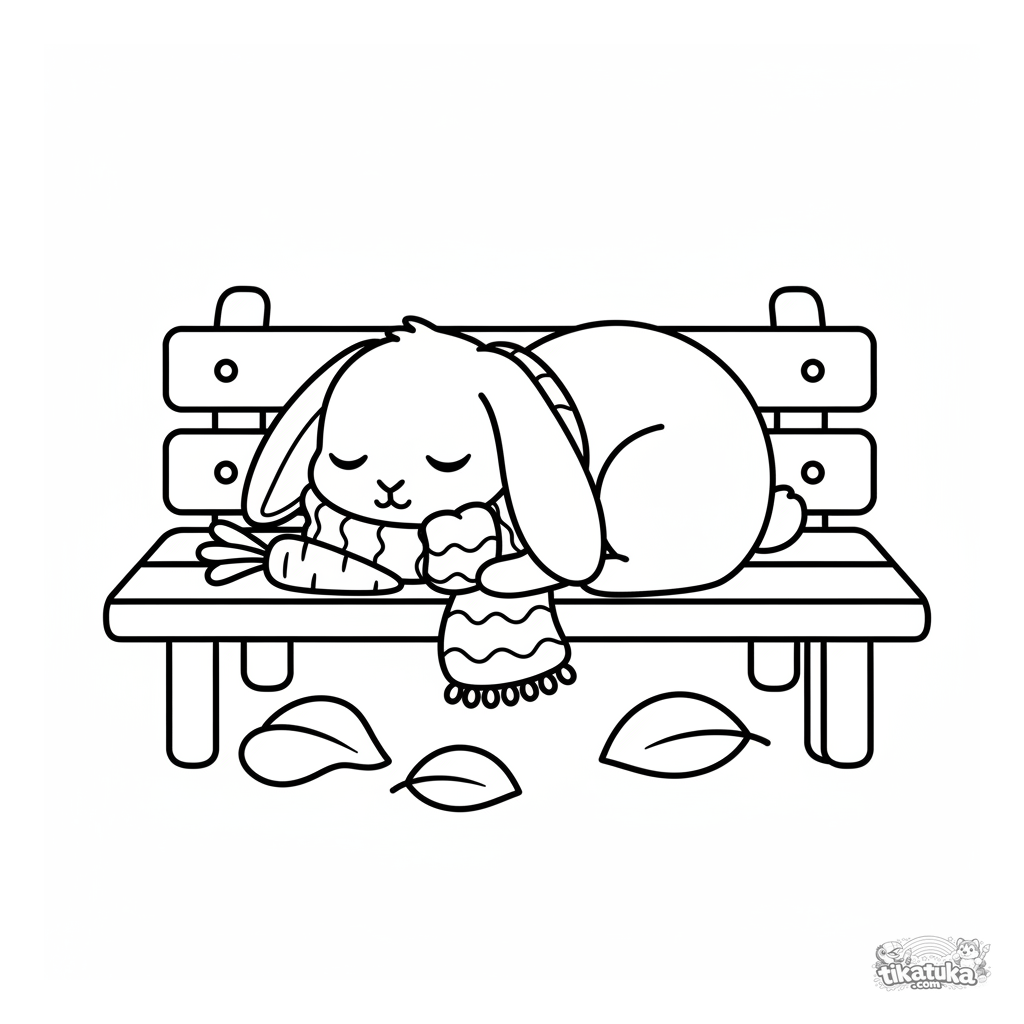 Página simples para colorir para crianças pequenas de 2-3 anos: um coelho de peluche fofo cochila em um banco de parque.