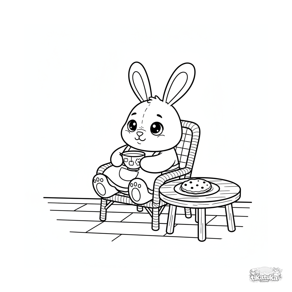 Página para colorir para crianças pequenas: um coelho de pelúcia toma chá em uma varanda de verão aconchegante. Formas grandes e simples.