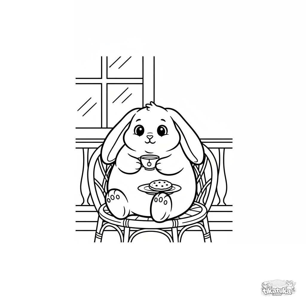 Página para colorir para crianças pequenas: um coelho de pelúcia segurando uma xícara em uma varanda de verão.
