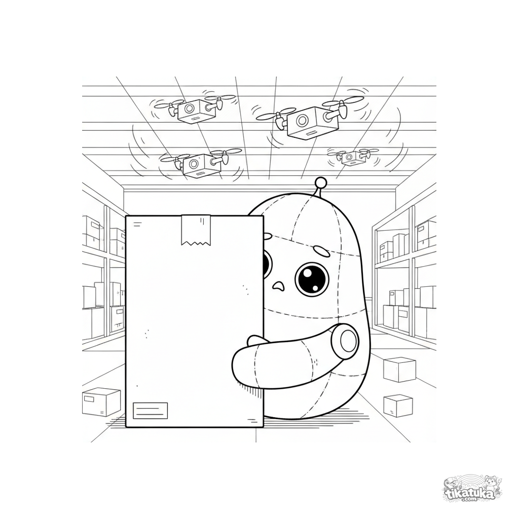 Página para colorir para crianças de 4-6 anos: um robô fofo de pelúcia com costuras e olhos de botão espreita timidamente de trás de uma caixa gigante em um armazém, observando drones de entrega passarem rápido.