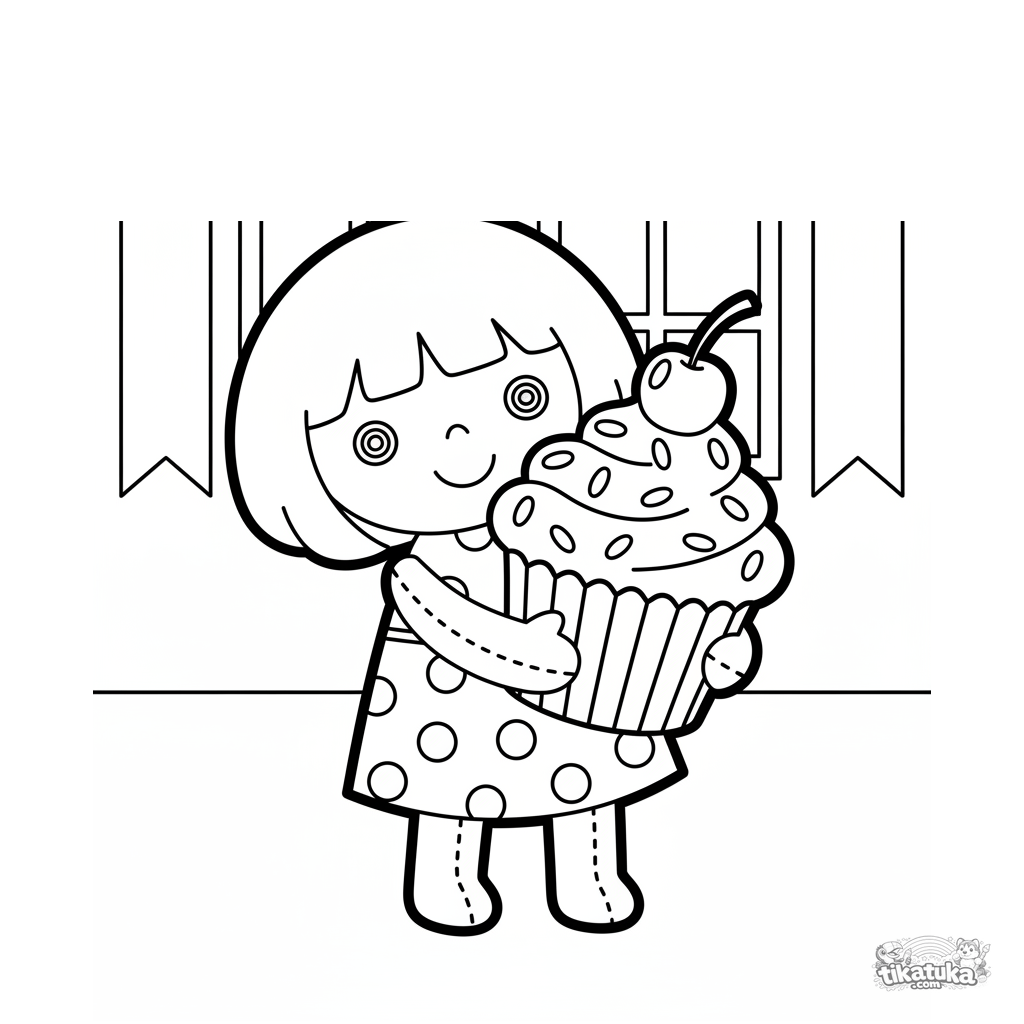 Página para colorir para crianças pequenas: uma menina de pelúcia abraça um cupcake gigante em um salão festivo.